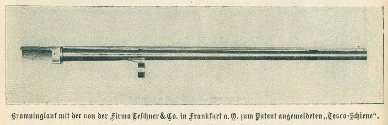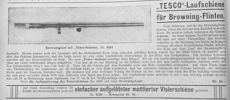 1/ the "Tesco-Schiene" (Tesco rail). A known problem of the early A5s is: it has no rail. The company G. Teschner & Co (maker of the Collath drillings and shotguns) in Frankfurt/Oder solved this problem. Their Tesco rail was advertised from at least 1910 until the end of the twenties (at least). Shown here are the drawings from German patent 276384 (filed October 23, 1913), a photo from a German hunting magazine "Das SchieĂźwesen" dated June 12, 1910 and a page from a 1913 dated Akah catalog.