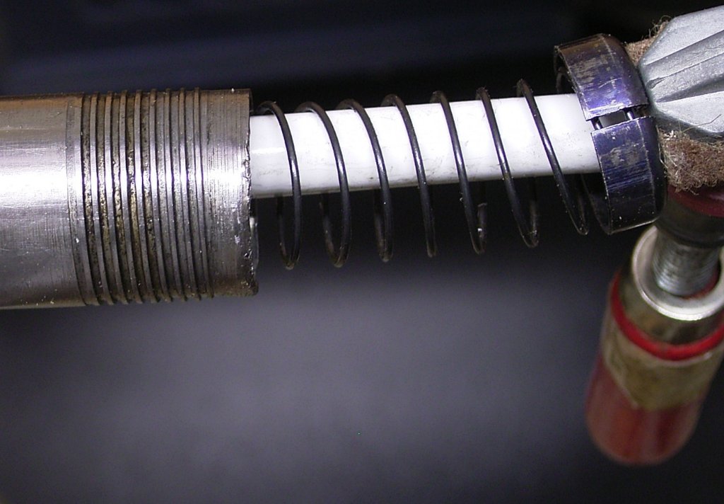 The split ring will take a little "persuasion" to move and then remove, in a perfect world, a pair of pliers that open when the handles are squeezed, and a flat tip at right angle to the pliers, to insert in the center of the ring just behind the flat surface that the plug is now resting against and pull straight out would be perfect. I don't seem to have anything made quite that way, so I insert the tip of a flat screwdriver behind it padded with a small cloth and gently pry towards the magazine cap a little at a time, working it out slowly from side to side, it takes a little practice but patience is key, once it is out far enough you will see the shoulder protruding out of the end of the magazine tube, this is when I grab a shop rag, and place it over the end of the tube, re-insert the screw driver and cover with one hand while pulling out the split ring with the other to catch the magazine spring ,and split collar together. It has tension but not a lot, it is not dangerous, just very surprising, protect your eyes with glasses. I have never seen an A5 that would require the replacing of the magazine spring or split collar, just keep them clean. Powder residue tends to eventually build up on the metal piece the first shell you load into the magazine rests against, this is what I am calling a follower, as you load more shells the crud travels up the magazine tube, that is why I suggest a lube that will stay dry so as not to attract any dirt or powder but still prevent any rust from building up inside the magazine tube, I have seen quite a few of them that were very dirty in this area, a spot usually overlooked when routine cleaning is performed.